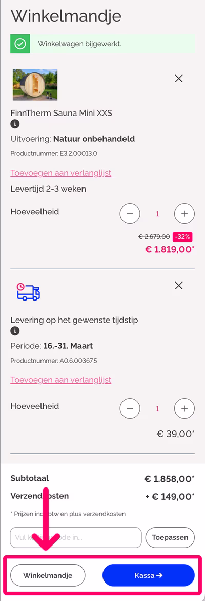 Zodra je de leveringsperiode, het product en eventuele extra’s hebt geselecteerd, klik op „In winkelwagen” om alles direct aan je winkelwagen toe te voegen.