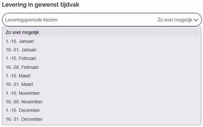 Kies je gewenste leveringsperiode. (Naast de maand kun je ook een periode van 14 dagen selecteren die het beste bij jou past, zodat de levering aan het begin of einde van de maand kan plaatsvinden).